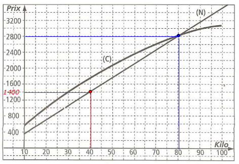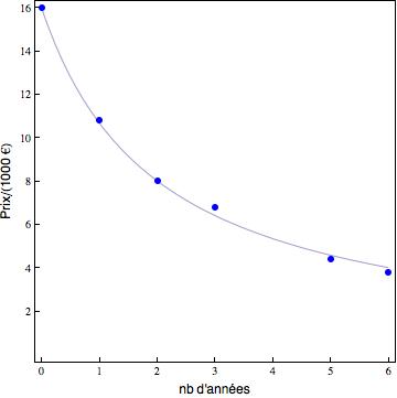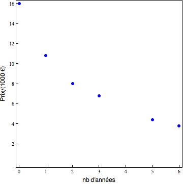 E-Bahut Barbidoux Posté(e) le 9 février 2012 E-Bahut Signaler Posté(e) le 9 février 2012 énoncé à vérifier.... exercice 4 = le prix moyen d'un véhicule d'occasion dépend du nombre d'années de son ancienneté. le tableau ci-dessous indique le prix moyen constaté du véhicule biomobile en l'an 2006 en fonction du nombre d'années d'ancienneté (les véhicules sortis en 2006 ont l'ancienneté x =0) Nombre d'années d'ancienneté x 0 1 2 3 4 5 6 Prix (en milliers d'euros) 16 10,8 8 6,8 ??? 4,4 3,8 (il manque une donnée) 1) Représenter graphiquement le prix de la biomobile en fonction de x en prenant les unités suivantes (1 cm pour un an en abscisse, 1 cm pour 1000€ en ordonnées). 2) on pose f(x) = 16000/(0,5x +1) (parenthèses ???), pour x appartenant à l'intervalle [0; 10].
