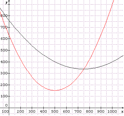 E-Bahut Papy BERNIE Posté(e) le 15 mars 2012 E-Bahut Signaler Posté(e) le 15 mars 2012 c) Tu rentres ta fct dans ta calculatrice avec la touche "f(x)". Tu appuies sur "2nde" puis "déf table" : DébTable=100 PasTable=100 Puis touche "fenêtre" : Xmin=100 Xmax=1000 Xgrad=100 Ymin=300 Ymax=800 Ygrad=100 Puis tu fais "graphe". Tu obtiens ce que je t'envoie ( j'ai vérifié que l'on obtenait la même chose avec ma TI-82). Tu vois sur le graph que CM(x) passe par un minimum pour x ~ 750 , valeur trouvée au b). 2) a) Cm(x)=C ' (x)=0.003x²-3x+900 b) On fait les mêmes remarques qu'au 1) b) donc : Cm(x) décroît sur [100;500] et croît sur [500;1000] --->500=-(-3)/(2*0.003) c) Graph de CM en noir et Cm en rouge. 3) Le coût marginal est égal au coût moyen pour la valeur de x pour laquelle le coût moyen est minimum. Tu résous : 0.003x²-3x+900=0,001x² - 1,5x + 900 Tu n'auras qu'une solution sur [100;1000] qui est x=750.