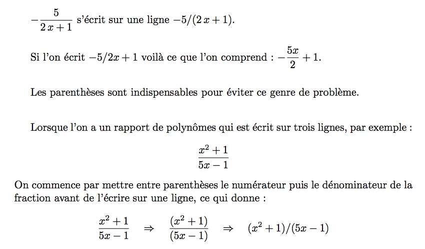 Étienne9 Posté(e) le 24 mars 2012 Signaler Posté(e) le 24 mars 2012 Donc si je comprends bien, le 1 n'est pas au dénominateur. C'est -5/2x _____________________+1 c'est ça ? Par contre à la question 1)c) c'est -5/(2x+1)____________-1 c'est ça ?