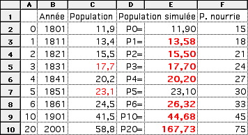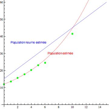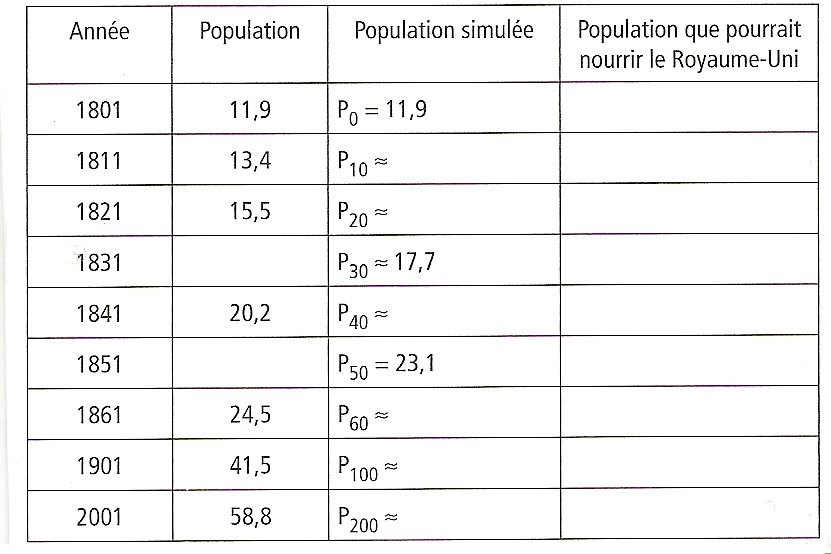 jerem=besoins d'aide Posté(e) le 1 avril 2012 Signaler Posté(e) le 1 avril 2012 Exercice 3 = l'économie anglais Thomas Malthus publie en 1789 son " Essaie sur le principe de population " dans lequel il prétend que la faim et la misère sont étroitement liés au fait " la population croît selon une progression géométrique " alors que " la nourriture disponible ne peut augmenter que selon une progression arithmétique" . Vérifions d'abord la première affirmation. le tableau ci-après donne la population du Royaume- Uni en millions d'habitants entre 1801 et 2001. 1) Calculer le taux d'évolution de la population entre 1801 et 1841 (on arrondira à 0,01%). 2) Calculer le taux d'évolution décennal (sur 10 ans) moyen sur cette période ( on arrondira à 0.01%). 3) On veut faire une simulation de l'évolution de la population du Royaume- Uni avec le taux décennal précédent. On note Pn cette population, n années après 1801. a) Calculer P10, P 20, P 40, P 60, P100, P 200 ( on fera les calculs exacts, et on arrondira à 0,1 % près) et compléter le tableau ci dessus. b) Que peut - on dire de la valeur obtenue par simulation pour 1841? et ensuite ? 4) a) On veut déterminer quand la population simulée aura doublé. Pour cela, calculer le taux annuel d'évolution équivalent au taux décennal utilisé ( on arrondira à 0,01%). b) Avec ce taux d'accroissement annuel, calculer la population simulée en 1852. Y a- t-il doublement de la population ? c) Combien d'années faut -il pour qu'il y ait de la population ? 5) On estime que le Royaume - Uni produisait en 1801 de quoi nourrir 15 millions de personnes et qu'il pouvait en nourrir 0,3 million de plus chaque année. a) Calculer le nombre de personnes que pouvait nourrir le Royaume - Uni chaque année du tableau, et en compléter la troisième colonne. b) En quelle année, d'après cette simulation, le Royaume -Uni ne pourrait -il plus nourrir sa population.