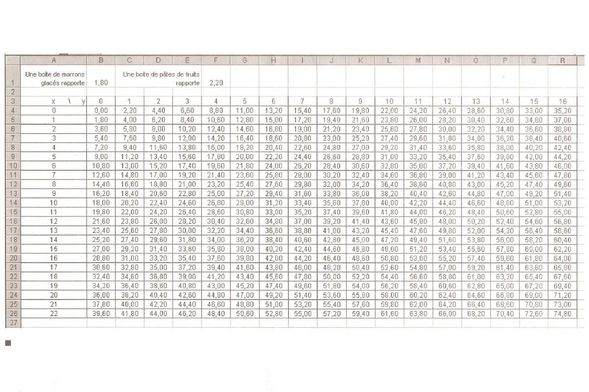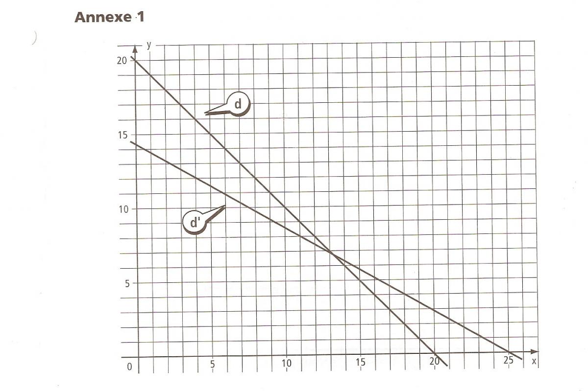 jerem=besoins d'aide Posté(e) le 9 avril 2012 Signaler Posté(e) le 9 avril 2012 Exercice 2 : Cet exercice comporte 2 annexes. un confiseur souhaite expédier par la poste des boîtes de marrons glacés et de pâtes de fruits. Chaque paquet -poste peut contenir au maximum 20 boîtes, et au maximum 5kg. une boîte de marrons glacés pèse 200g, une de pâtes de fruit 350g. Dans chaque paquet-poste, il veut mettre au moins 2 boîtes de marrons glacés. soit x le nombre de boîtes de marrons glacés, et y celui de boîtes de pâtes de fruits mises dans un paquet-poste. 1) a) Montrer que les nombres x et y doivent vérifier le système (S) suivant, avec x et y entiers: X+y ≤20 220x +350y ≤5000 x≥2 (S) y≥0 b) On a représenter sur le graphique fourni en annexe 1 les droites d et d' d'équation respective : y = -x +20 et y = -4/4 x +100/7 . En transformant les deux premières inéquations du système, montrer que ces droites permettent la résolution graphique du système ( S). Résoudre alors graphiquement le système ( S). On hachura les zones du plan qui ne conviennent pas. c) A l'aide du graphique , répondre aux questions suivantes : - le confiseur peut-il mettre 12 boîtes de marrons glacés et 7 de pâtes de fruits dans un paquet-poste ? - le confiseur peut-il mettre 16 boîtes de marrons glacés et 4 de pâtes de fruits dans un paquet- poste ? - le confiseur peut- il mettre 10 boîtes de marrons glacés et 9 de pâtes de fruits dans un paquet -poste? 2) Une boîte de marrons glacés rapporte 1.80 € , une de pâtes de fruits 2.20€ a) exprimer en fonction de x et y ce que rapporte le contenu d'un paquet- poste. b) On utilise un tableur pour déterminer le couple ( x; y) qui rapporte le plus. on donne en annexe 2 la feuille de calcul de ce que rapporte le contenu d'un paquet -poste. Par exemple , la cellule E6 donne ce que rapporte un paquet-poste contenant 2 boîtes de marrons glacés et 3 boîtes de pâtes de fruits. Pour remplir ce tableau , on a rentré les bénéfices dans les cellules B1 et F1, puis on a rentré une formule dans la cellule B4 et effectué un " copier- glisser" dans les autres cellules du tableau. Donner la formule rentré en B4. c) Dans le tableau, certaines cellules correspondent à des valeurs de x et y qui ne conviennent pas ( par exemple, on ne peut pas mettre 12 boîtes de marrons glacés et 9 boîtes de pâtes de fruits). Barrer les cellules correspondant à ces valeurs de x et Y . d) En déduire le bénéfice maximum possible sur un paquet-poste, et indiquer les valeurs de x et y correspondantes.