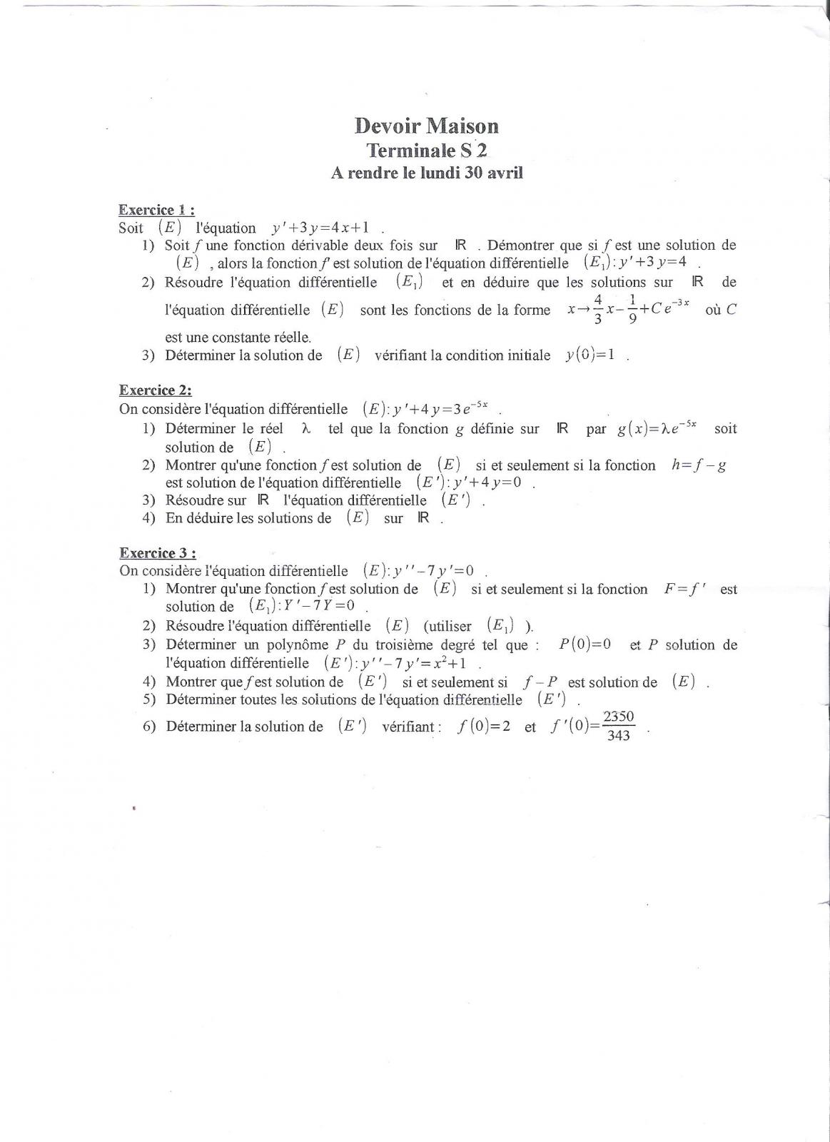Hiphigenie Posté(e) le 27 avril 2012 Signaler Posté(e) le 27 avril 2012 Bonsoir ramz503, Exercice 1. 1) f est solution de (E). Donc f ' + 3f = 4x + 1 Nous dérivons : f '' + 3f ' = 4. (f ')' + 3f' = 4. Par conséquent, f ' est solution de (E1). 2) Les solutions de l'équation y' + 3y = 4 sont de la forme k.e-3x + 4/3. c'est-à-dire f '(x) = k.e-3x + 4/3. On sait que f est solution de l'équation y' + 3y = 4x + 1. Donc k.e-3x + 4/3 + 3f(x) = 4x + 1. 3f(x) = 4x -1/3 - k.e-3x f(x) = (4/3)x - 1/9 - (k/3)e-3x Il suffit de poser C = -k/3. 3) Je te le laisse...