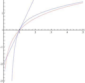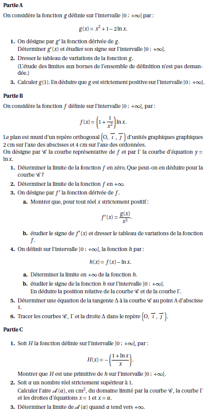 E-Bahut Barbidoux Posté(e) le 21 mai 2012 E-Bahut Signaler Posté(e) le 21 mai 2012 Rapidement fait à vérifier quand même...... g(x)=x^2 - 2 ln(x) + 1 g'(x)=2*x-2/x=2*(x^2-1)/x x........0................1..................... g'(x)..........(-).......(0)......(+)....... g(x)......decrois.....Min....crois....... g(0) -> ∞ et Min g(x)=g(1)=1 ==> g(x) >0 sur ]0, ∞[ B------------ f(x)=(1+1/x^2)ln(x) on pose y=x^2 ==> x=√y Lorsque x->0 alors y->0 et lim f(x)=(1+1/x^2)ln(x)=(1+1/y)ln(√y))=lim ln√y+(1/2)*lim ln(y)/y lim√y -> -∞ et (1/2)*lim ln(y)/y->1/2 ==> lim f(x)=(1+1/x^2)ln(x) -> -∞ Asymptote verticale pour x=0 ---------- Lorsque x->∞ alors y->∞ et lim f(x)=(1+1/x^2)ln(x)=(1+1/y)ln(√y))=lim ln√y+(1/2)*lim ln(y)/y lim√y -> ∞ et (1/2)*lim ln(y)/y->0 ==> lim f(x)=(1+1/x^2)ln(x) -> ∞ ---------- f'(x)=(1 + 1/x^2)/x - (2 ln(x))/x^3=(x^2 - 2 ln(x) + 1)/x^3=g(x)/x^3 f'(x)>0 sur ]0, ∞[ ==> f(x) croissante sur son intervalle de définition ---------- h(x)=ln(x)/x^2 on pose x^2=y ==> x=√y Lorsque x->∞ alors y->∞ et lim h(x)=ln(x)/x^2=lim ln√y/y= lim (1/2) ln(y)/y -> 0 (croissance comparée de ln(y) et de y ---------- h(1)=0 et h(1)<0 pour x<1 et >0 pour x>1 x..........0...................1.......................... h(x)...............(-).......(0)........(+)........... ---------- Le graphe de f(x) est en dessous de celui de y pour x<1 et au dessus pour x>1 ---------- Equation de la tangente à f(x) au point d'abscisse 1 y1=f'(1)*(x-1)+f(1)=2*(x-1) C-------------- H'(x)=-(-ln(x) - 1)/x^2 - 1/x^2=ln(x)/x^2 --------- aire A(a)=Somme de 1 à a de f(x)=[H(x)]1a =1-(1+ln(a))/a ---------- lorsque a-> ∞ lim A(a)=1-(1+ln(a))/a=1
