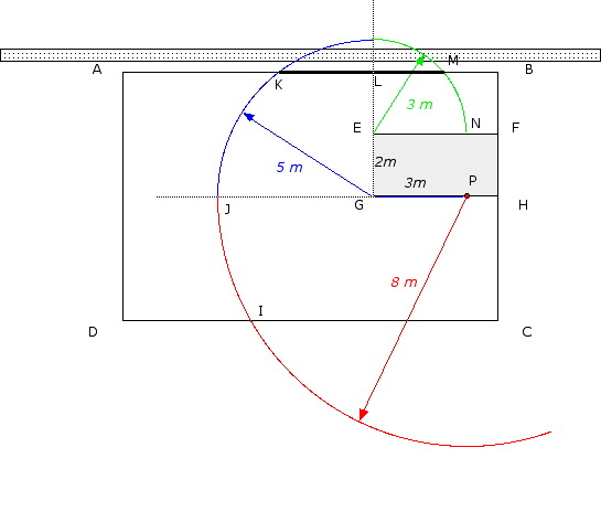 E-Bahut Barbidoux Posté(e) le 15 septembre 2012 E-Bahut Signaler Posté(e) le 15 septembre 2012 Lorsque la chèvre se trouve en dessous de la droite GH elle peut se mouvoir, en l'absence, d'obstacles à l'intérieur d'un cercle de rayon 8 m (longueur de sa corde). Elle peut donc brouter dans la surface HCIJ. Lorsque la chèvre se trouve en dessus de la droite GH et à gauche de la droite EG elle peut se mouvoir, en l'absence, d'obstacles à l'intérieur d'un cercle de rayon 5 m (longueur de sa corde-PG). Elle peut donc brouter dans la surface GJKL. Lorsque la chèvre se trouve en dessus de la droite GH et à droite de la droite EG elle peut se mouvoir, en l'absence, d'obstacles à l'intérieur d'un cercle de rayon 3 m (longueur de sa corde-PG-GE). Elle peut donc brouter dans la surface ELMN. Le trait épais en noir indique la portion de barrière qui doit être renforcée pour que la chèvre ne puisse manger manger les savoureuses fleurs plantées au bord du chemin.