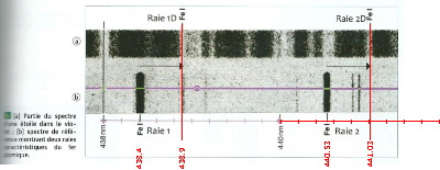 E-Bahut Barbidoux Posté(e) le 4 novembre 2012 E-Bahut Signaler Posté(e) le 4 novembre 2012 1a--------------- Lorsque l'astre s'éloigne le décalage d'une raie spectrale caractéristique de la lumière qu'elle émet s'effectue en direction des grandes longueurs d'onde ce qui fait que la fréquence caractéristique de cette rais spectrale diminue. 1b--------------- L'étoile s'éloigne de l'observateur ayant réalisé ce spectre (décalage vers grandes longueurs d'onde des raies de l'élément fer présent dans la lumière émise par l'étoile) 1c--------------- Le redshift est un phénomène astronomique de décalage vers les grandes longueurs d'onde des raies spectrales et de l'ensemble du spectre, ce qui se traduit par un décalage vers le rouge pour le spectre visible. 4--------------- le1=4387.4 nm le2=440.53 nm lr1=438.9 nm lr2=441.03 nm vitesse de déplacement de l'étoile calculée à partie de la raie le1 -c*(lr1-le1)/le1=V=341.9 km/s vitesse de déplacement de l'étoile calculée à partie de la raie le2 -c*(lr2-le2)/le2=V=340,2 km/s Résultas cohérents