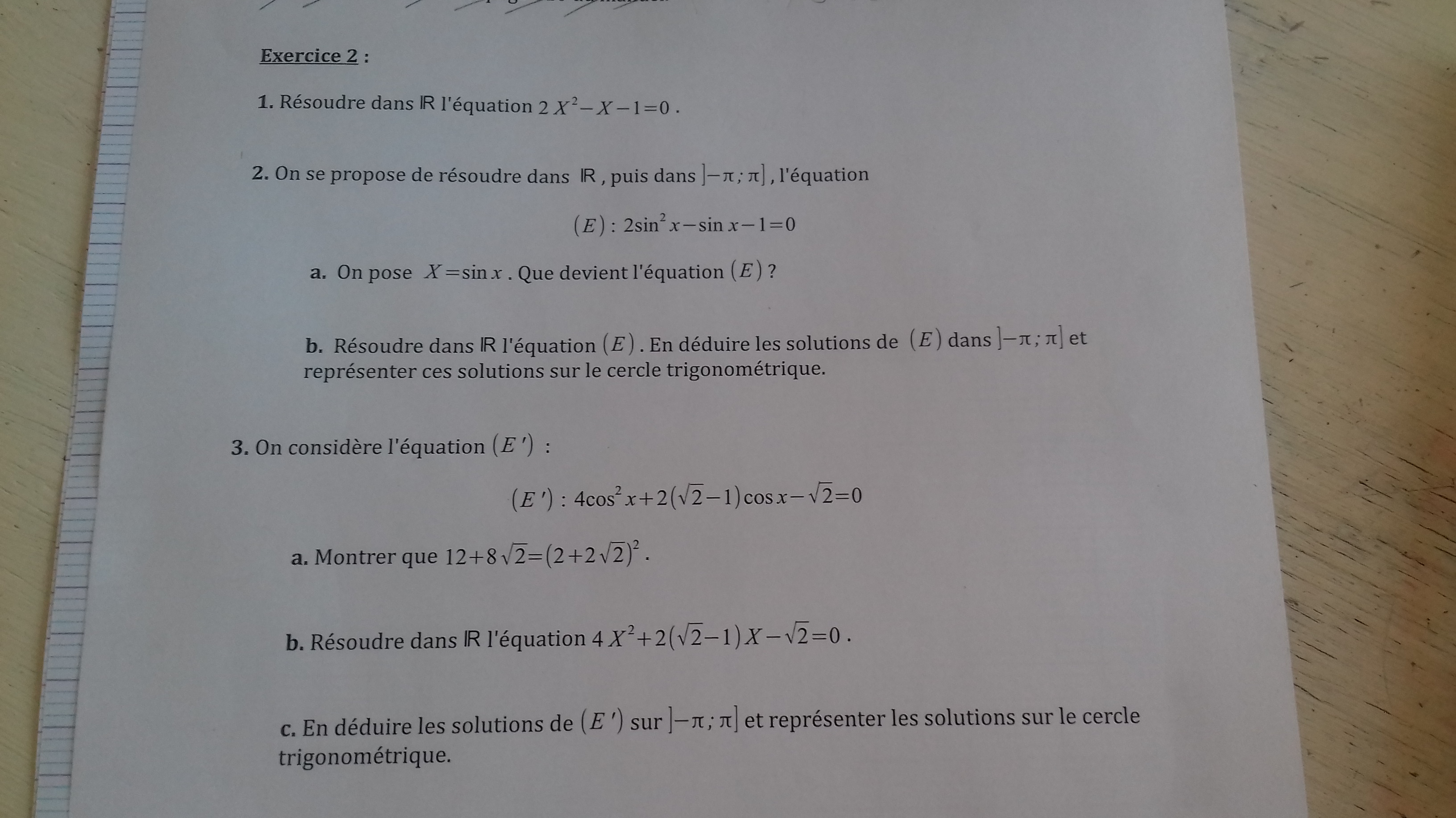 E-Bahut Barbidoux Posté(e) le 22 décembre 2012 E-Bahut Signaler Posté(e) le 22 décembre 2012 1: résoudre dans R l'équation 2x²-x-1=0 j'ai trouvé -1/2 et 1 (correct) 2: On se propose de résoudre dans ]- ; ], puis dans R, l'équation (E) 2sin²x-sinx-1=0 a) démontrer que 12+8 2=2*(2+ 2)² 2*(2+√2)^2=2*(4+4*√2+2)=18+8*√2 b) on pose X=sinx. Que devient l'équation (E)? 2*x^2 - x - 1 = 0 c) Résoudre dans ]- , ] l'équation (E) solutions {-1/2,1} Représenter les solutions sur un cerce trigonométrique. quelles sont les solutions dans R de cette équation? sin(x)=1 ==>x=π/2 et x =-π/2 sin(x)=-1/2 ==> x= 5*π/6 et x= 7*π/6 3: On considère l'équation (E) 4cosx²+2( 2-1)cosx- 2=0 a) Résoudre dans R l'équation: 4x²+2( 2-1)x- 2=0 Solutions {1/2 et -√2/2} b) utiliser la question 2a) pour résoudre dans l'intervalle ]- ; ] l'équation (E') cos(x)=1/2 ==> x= π/3 et x=-π/3 cos(x)=-√2/2 ==> x= 3*π/4 et x=5*π/4 c) représenter les solutions sur un cercle trigonométrique. 4: Résoudre dans]- ; ] l'équation sin²x+sinx-2=0 On pose sin(x)= y avec y appartenant à [-1,1] ==> y^2+y-2=0 Solutions {-2,1} ==> on ne garde que la solution y=1 ==> y=sin(x)=1 ==> x=π/2 et x=-π/2