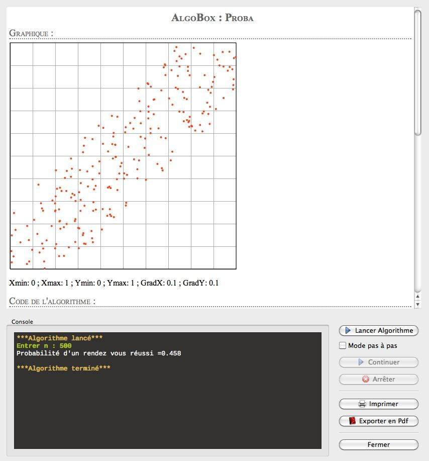 E-Bahut Barbidoux Posté(e) le 30 janvier 2013 E-Bahut Signaler Posté(e) le 30 janvier 2013 Algorithme : Proba - 29.01.2013 ****************************************** ****************************************** 1 VARIABLES 2 a EST_DU_TYPE NOMBRE 3 c EST_DU_TYPE NOMBRE 4 n EST_DU_TYPE NOMBRE 5 i EST_DU_TYPE NOMBRE 6 k EST_DU_TYPE NOMBRE 7 x EST_DU_TYPE NOMBRE 8 y EST_DU_TYPE NOMBRE 9 DEBUT_ALGORITHME 10 LIRE n 11 POUR i ALLANT_DE 1 A n 12 DEBUT_POUR 13 a PREND_LA_VALEUR random() 14 c PREND_LA_VALEUR random() 15 SI ((a-c) 1/4 ET (a-c)-1/4) ALORS 16 DEBUT_SI 17 k PREND_LA_VALEUR k+1 18 TRACER_POINT (a,c) 19 FIN_SI 20 FIN_POUR 21 AFFICHER "Probabilité d'un rendez vous réussi =" 22 k PREND_LA_VALEUR k/n 23 AFFICHER k 24 FIN_ALGORITHME