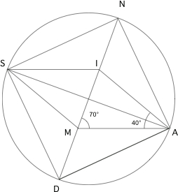 E-Bahut Barbidoux Posté(e) le 7 mars 2013 E-Bahut Signaler Posté(e) le 7 mars 2013 1--------------- HMA est rectangle en M (triangle inscrit dans un cercle ayant un de ses coté, (l'hypoténuse HA) comme diamètre) MAT est rectangle en A (triangle inscrit dans un cercle ayant un de ses coté, (l'hypoténuse MT) comme diamètre. Le quadrilatère MATH qui a deux angles droits consécutif est un rectangle. Lorsque ses diagonales son perpendiculaires c'est un carrée alors MATH est un carré lorsque [MT ] et [MH] sont perpendiculaires 2---------------- Sommes de angles d'un triangle = 180° L'angle MIA du triangle MIA vaut 70° et le triangle MIA est isocèle en A ==> MAIS est donc un losange (parallélogramme ayant deux côtés consécutifs égaux). ---------------- Les diagonales d'un losange se couplent à angle droit et IA+IS ==> IM est la médiatrice de SA ==> SN=NA et SD=DA Le triangle SNA est rectangle en N (triangle inscrit dans un cercle ayant un de ses coté, (l'hypoténuse SA) comme diamètre) Le triangle SDA est rectangle en N (triangle inscrit dans un cercle ayant un de ses coté, (l'hypoténuse SA) comme diamètre) ND est un axe de symétrie pour le quadrilatère DANS qui ayant deux angles opposés SNA et SDA droits est un carré.