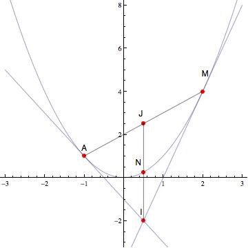 E-Bahut Barbidoux Posté(e) le 4 mai 2013 E-Bahut Signaler Posté(e) le 4 mai 2013 Dans un repère, f st la fonction définie sur R par f(x)=x². P est sa courbe représentative.A est le point de P d'abscisse -1. M est un point variable de P d'abscisse m(m -1). Les tangentes à la courbe en A et M se coupent en l . Les points J et N sont les milieux respectifs des segments [am]et [iJ]. On s'intéresse aux questions suivantes: - A quelle ligne appartient le point N? -Quelle particularité présente la tangent en N à cette ligne? 2)Démontrer a. Démontrer que la tangente en M a pour équation y=2mx-m² ------------- expression de la tangente en m à f(x) y=f'(m)*(x-m)+f(m) ---- f'(x)=2*x ==> y=2*m*(x-m)+m^2=2*m*x-m^2 ------------- b. déduisez en l'equation de la tangente en A ------------- y=f'(-1)*(x+1)+1=-2*(x+1)+1=-2*x-1 ------------- c. Calculer les coordonnées de I et de celles de J ------------ Les coordonnées de I sont solution du système d'équation : y=2*m*x-m^2 y=-2*x-1 on obtient x=(m-1)/2 et y=-m ==> I{(m-1)/2, -m} Les coordonnes de J sont J{(xM+xA)/2, (yM+yA)/2} J{(m-1)/2, (m^2+1)/2} N{(m-1)/2,(m^2-2*m-1)/4} =N{(m-1)/2, ((m-1)/2)^2} ----------- d. Sur quelle ligne se déplace N ----------- Sur le tracé de f(x) ------------ c. étudiez la position relative de la droite (AM)et de la tangente en N a P AM à pour coefficient directeur (yM-yA)/(xM-xA)=(m^2-1)/(m+1)= m-1 puisque m≠ 1 La tangente en N à f(x) à pour coefficient directeur f'((m-1)/2=2*(m-1)/2=m-1 Ces deux droites ayant même coefficient directeur sont donc parallèles.
