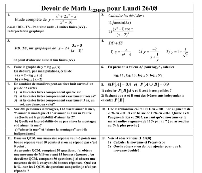 E-Bahut pzorba75 Posté(e) le 25 août 2013 E-Bahut Signaler Posté(e) le 25 août 2013 Pour le 12 1 avec une calculatrice moy=5, sigma=3,08 2 moy=10 =>5*10=50-(1+3+8+8)=30 => il faut ajouter 30