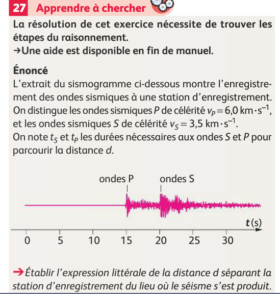 aprer Posté(e) le 17 septembre 2013 Auteur Signaler Posté(e) le 17 septembre 2013 L'aide dit : a) Identifier les ondes S et P en comparant leur célérité. J'ai fais : cP = 6 km.s = 6*10^3 m.s cS = 3,5 km.s = 3,5*10^3 m.s b) Donner 2 expressions pour la distance d en fonction de la célérité de chacune des ondes et de leur durée de propagation c=d/delta T et d=c*delta T Puis je suis bloqué c) Faire la différence entre les durées de propagation des 2 ondes