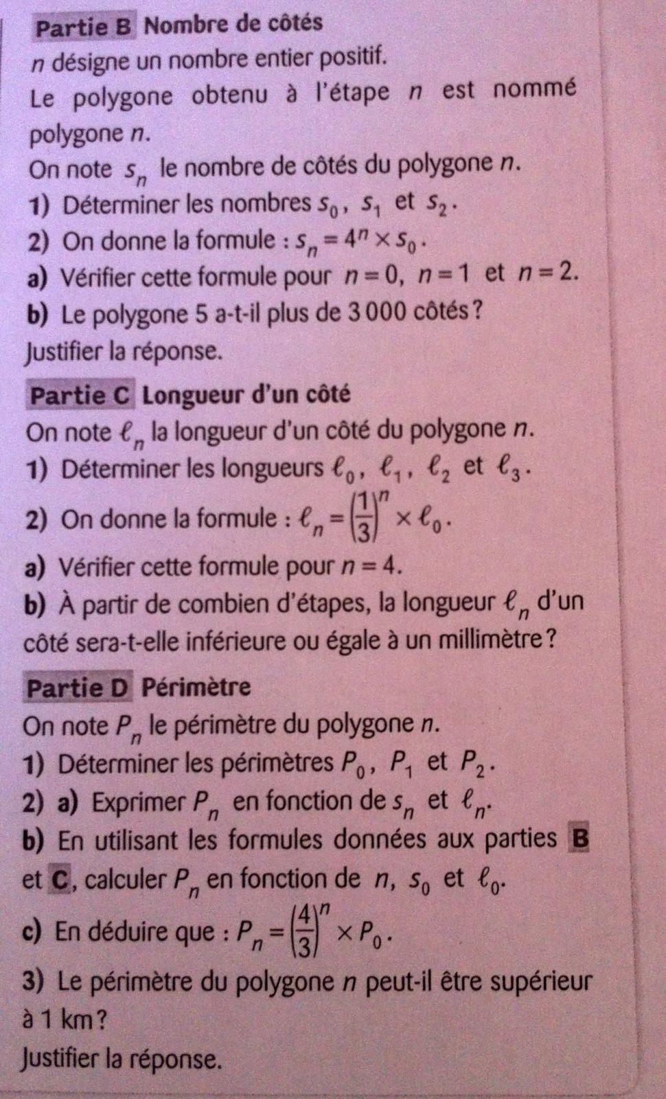 Julia21120 Posté(e) le 23 septembre 2013 Signaler Posté(e) le 23 septembre 2013 Bonjour, Serait-il possible que quelqu'un m'aide pour un devoir maison de mathématique (3eme) ? PARTIE A : Construction d'un flocon de Von Koch : qui à été fait sans problème Ensuite, il reste les parties B/C/D que je n'arrive pas à faire. (en photo) Merci d'avance.