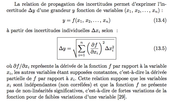 E-Bahut Barbidoux Posté(e) le 28 septembre 2013 E-Bahut Signaler Posté(e) le 28 septembre 2013 Petite erreur de frappe dans la formule ∆V=√((1/(Tau*n))^2*∆D^2+(D/(Tau^2*n))^2*∆Tau^2+(D/(Tau*n^2))^2*∆n^2) qui est plus explicite sous cette forme Tu disposes : - de la mesure de D et de son incertitude ∆D - de la mesure de Tau et de son incertitude ∆Tau - de la mesure de n et de son incertitude ∆n simple application numérique ...