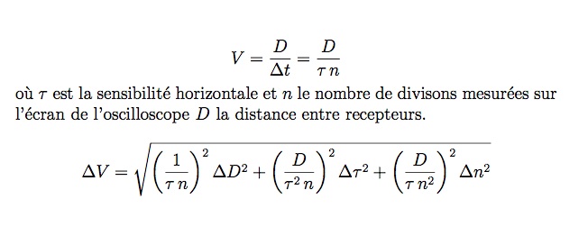E-Bahut Barbidoux Posté(e) le 28 septembre 2013 E-Bahut Signaler Posté(e) le 28 septembre 2013 la relation qui lie la vitesse à la distance D entre R1 et R2 ( récepteurs ) a pour expression : V=D/∆t=D/(Tau*n) où Taux est la sensibilité horizontale et n le nombre de divisons mesurées sur l'écran de l'oscilloscope La relation de propagation des incertitudes (voir document joint) permet d'estimer ∆V selon : ∆V=√((1/(Tau*n))^2*∆V^2+(D/(Tau^2*n))^2*∆Tau^2+(D/(Tau*n^2))^2+∆n^2)
