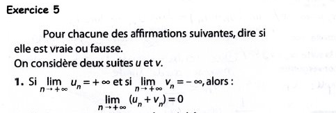 Amicie Posté(e) le 29 septembre 2013 Auteur Signaler Posté(e) le 29 septembre 2013 Merci pour votre réponse. Est-ce que pour la 4 c'est pace que est équivaut à dire que les suites u(n) et v(n) convergent vers la même limite? Je pensais que la question 1 était vraie car : - = Pourriez-vous m'aider à comprendre svp?