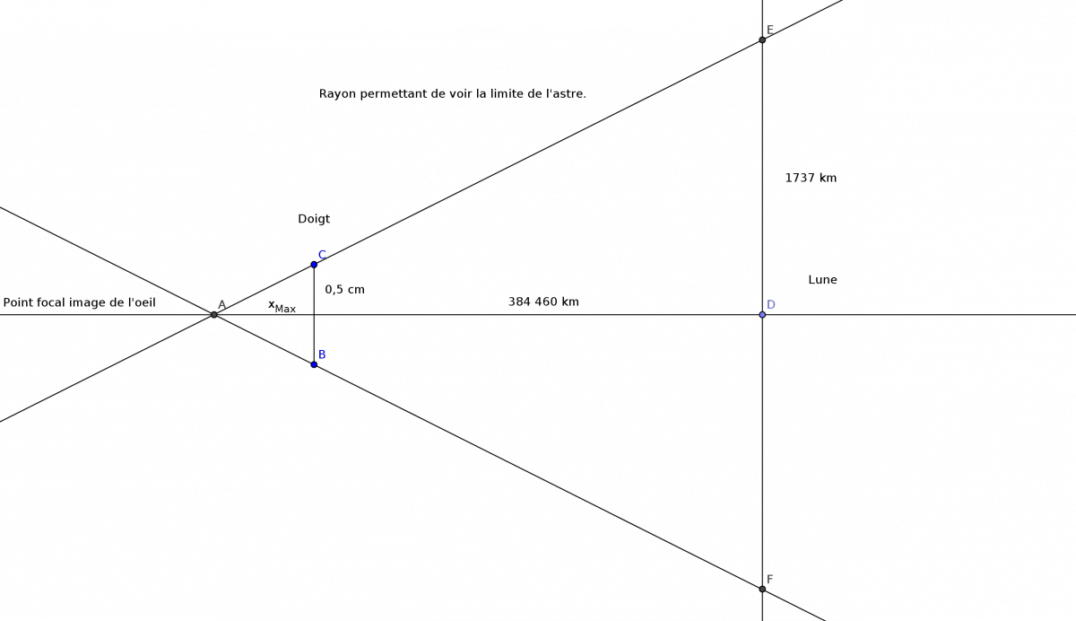 hugo30 Posté(e) le 6 octobre 2013 Signaler Posté(e) le 6 octobre 2013 Bonjour et merci pour vos explications qui m'ont bien aidé! Cependant je ne suis pas très sûr de mes calculs. Si j'applique le théorème de thalès: AC AB BC ----- = ------ = ----- AC étant la distance oeuil/doigt, AE distance oeuil/lune, BC rayon du doigt et EF rayon de la lune AE AF EF Merci de me dire si mon raisonnement est juste avant que je ne me lance dans les calculs! Par ailleurs je ne vois pas comment utiliser x . S'il a une importance dans la résolution c'est que j'oublie quelque chose!