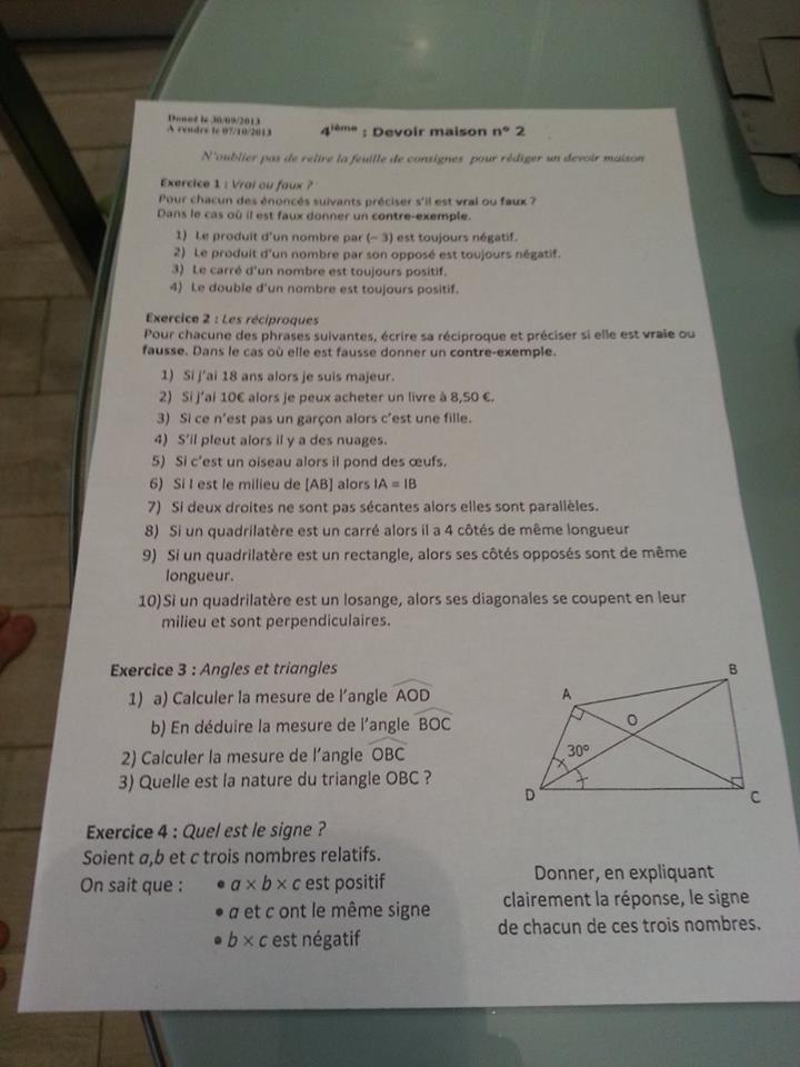 cocopedroza Posté(e) le 5 octobre 2013 Signaler Posté(e) le 5 octobre 2013 Bonjours, je voudrais s'avoir si mon Devoir Maison est juste, merci d'avance de votre aide. Exercice1: 1) faux: (-3)x5=15 2) vrai 3)vrai 4) vrai Exercice2 1) Si j'ai 18ans alors je suis majeur. Vrai 2)Si j'ai 10 euro alors je peux acheter un livre a 8,50 euro. Vrai 3)Si ce n'est pas un garçon alors c'est une file. Vrai 4) S'il pleut il y a des nuages. Faux: Il pleut et le ciel est gris sans nuage. 5)Si c'est un oiseau alors sil pond des œufs: faux, un coq est un oiseau et il ne pont pas d’œufs. 6)si i est le milieu de [AB] alors iA= iB. Vrai 7)Si deux droite ne sont pas sécantes alors elle sont parallèles. Vrai 8)Si un quadrilatère est un carré alors il a 4 coté de même longueur. Vrai 9) Si un quadrilatère est un rectangle, alors ses coté oposé sont de meme longueur. Vai 10) Si un quadrilatère est un losange, alors ses diagonales se coupent en leur mileu et sont perpendiculaires. Vrai Exercice3 1) a. l'angle DAO est égale a 90° et ADO est égales a 30° La somme des angles d'un triangle doit faire 180° donc: 90°+30°=120° 180°-120°=60° donc: L'angle AOD est égale a 60°. b.BOC est l'oposé de ADO , donc BOC=AOD=60° BOC mesure 60°. 2) On sais que l'angle AOD fait 60° soit 60°+60°= 120° 180°-120°= 60° Donc OBC fait 60° 3) je n'est pas compris comment trouver. Exercice 4 Je n'est pas compris cette exercice. Je vous remercie d'avance de votre aide.