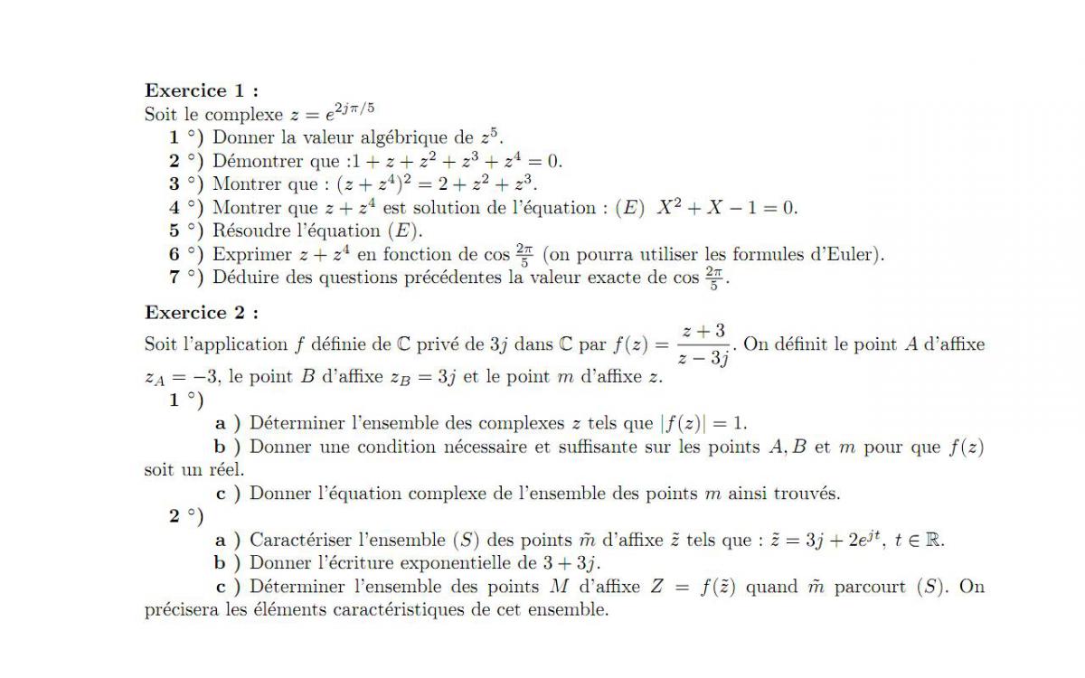 j-l Posté(e) le 5 octobre 2013 Signaler Posté(e) le 5 octobre 2013 Bonjour à tous, je bloque sur deux exercices sur les complexes, merci d'avance pour votre aide et votre compréhension. Pour l'exercice 1: 1°) je trouve z5=1. 2°) j'ai utiliser une formule. Je trouve (1-z5/1-z)=0, en sachant que z5=1 c'est donc démontrer. C'est à partir de là que je bloque.