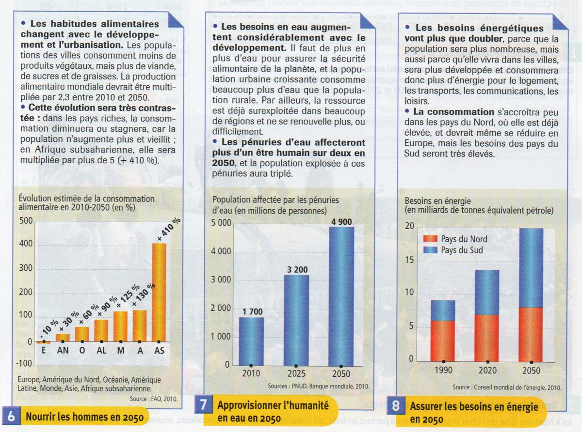 Ch00Ch00 Posté(e) le 22 octobre 2013 Auteur Signaler Posté(e) le 22 octobre 2013 En 2050, la population mondiale atteindre 10 milliards contre 7,18 milliards d'habitants en 2013. Le plus grand défis de la planète est de nourrir le monde. La population des villes consomment moins de produits végétaux mais plus de viande, de sucres et de graisse. L'alimentation devra donc augmenté, multiplié par 3. Les besoins d'eau sont importants. Il faut de plus en plus d'eau, la population urbaine consomme beaucoup plus d'eau que la population rurale. Certaines régions, sont déjà surexploitée et ne renouvelle plus, ou difficilement. Mais les pénuries d'eau affecteront plus d'un être humain sur deux en 2050. Comme la population sera beaucoup plus nombreuse mais elle vivra dans des villes qui sera développée et consommera plus d'énergie pour le logement, les transports, les communications... La consommation s'accroîtra dans les pays du Nord, elle est déjà élevée, et devrait se réduire en Europe, les pays du Sud consommeront beaucoup plus d'énergie que les pays du Nord. Le monde aura besoin de 3 fois plus d'énergie en 2050. Voilà, qu'est-ce qu'un vous en pensez? Merci !