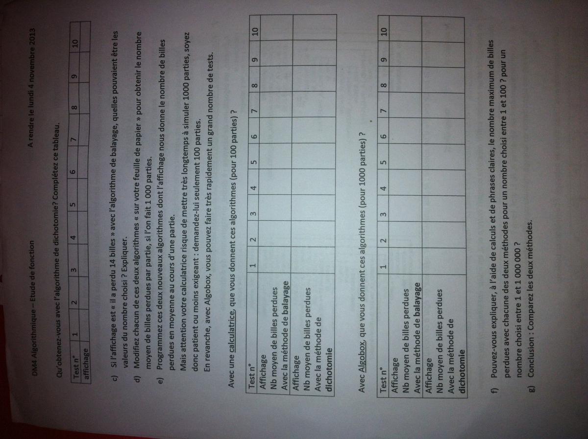 Maady Posté(e) le 3 novembre 2013 Signaler Posté(e) le 3 novembre 2013 Bonsoir, J'ai cet exercice d'algorithme (en fichier joint) à faire et je bloque car je ne comprends pas les algos notamment à la correspondance des variables Mes recherches : 1)A. Mattéo ne perd aucune billes si il a de la chance car il tombera sur le nombre pensé par Louane B. Il perdra le nombre de billes séparant sa première proposition du nombre pensé par Louane C. Mattéo peut commencer par diviser l'intervalle en 2 donc proposer 50 puis si Louane lui indique que le nombre est plus grand il divise à nouveau par 2 (donc 75) puis ainsi de suite Il perdrait au maximum 8 billes D. / Merci d'avance !