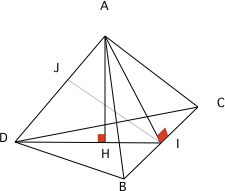 E-Bahut Barbidoux Posté(e) le 24 novembre 2013 E-Bahut Signaler Posté(e) le 24 novembre 2013 DI est la médiane du triangle BDC ce triangle étant équilatéral c'est aussi la hauteur issue de D et la médiatrice de BC. AI est la médiane du triangle ABC ce triangle étant équilatéral c'est aussi la hauteur issue de A et la médiatrice de BC. Elle est perpendiculaire à BC et sa longueur vaut a*√3/2. Conclusion : La droite CB est perpendiculaire au plan DBC qui contient la droite AH donc à AH. Cette droite AH étant perpendiculaire à deux droite du plan DCB est perpendiculaire à ce plan. -------------- L'angle entre les plans ABC et BCD est égal à l'angle AID. Le triangle ADI est isocèle et AID=2*ArcTan(IJ/AI)=2*ArcSin((a/2)/(a*√3/2))=ArcSin(√3/3)=70.53° -------------- L'angle entre AB et le plans ABC est égal à l'angle ADI. Le triangle ADI est isocèle ==> 2*ADI+DIA=180° ==> ADI=(180-70.53)/2=54.74