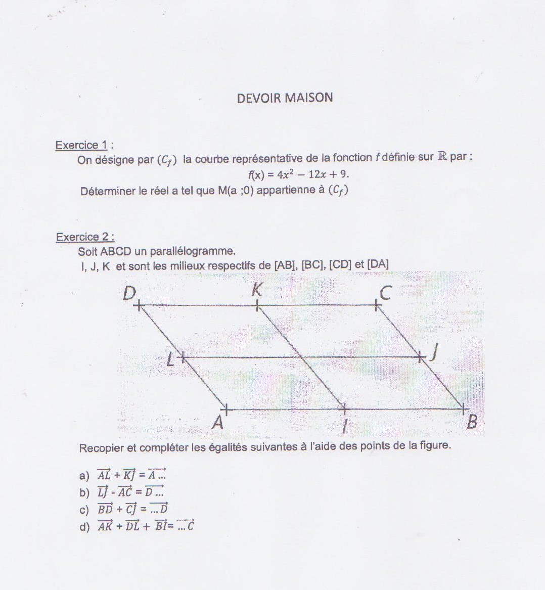 E-Bahut Barbidoux Posté(e) le 7 décembre 2013 E-Bahut Signaler Posté(e) le 7 décembre 2013 -------------- Exercice 1 -------------- f(x)=4*x^2-12*x+9=(2*x-3)^3 ==> M{3/2,0} -------------- Exercice 2 -------------- O est le centre du parallélogramme ==> DK=KC=LO=OJ=AI=IB DL=LA=KO=OI=CJ=JB DO=KJ=LJ=OB -------------------- Relations vectorielles AL+KJ=AL+LI=AI LJ-AC=LJ+CA=DC+CA=DA BD+CJ=BD+DL=BL AK+DL+BI=IC+CJ+JO=IO=JC