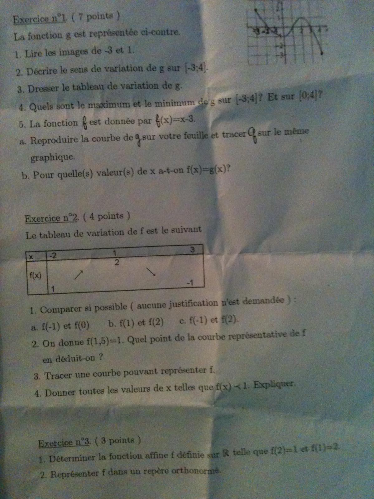 abby800 Posté(e) le 18 décembre 2013 Signaler Posté(e) le 18 décembre 2013 Exercice N°1 La fonction g est représentée ci-contre 1.Lire les images de -3 et 1 2.Décrire le sens de variation de g sur [-3;4] 3.Dresser le tableau de variation de g 4.Quels sont le maximum et le minimum de g sur [-3;4]? Et sur [0;4]? 5.La fonction f est donnée par f(x)=x-3 Exercice n°3 (le tableau et sur le sujet) 1.Comparer si possible ( aucune justification n'est demandée): a.f(-1) et f(0) b.f(1) et f(2) c.f(-1) et f(2) 2.On donne f(1,5)=1.Quel point de la courbe représentative de f en déduit-on? Exercice n°3: 1. Déterminer la fonction affine f définie sur R telle que f(2)=1 et f(1)=2 2.Représenter f dans un repère orthonormé Exercice n°5: 1.Soit f la fonction affine définie su R par f(x)=-2x+3. Donner son tableau de signe . 2.Soit g la fonction affine définie sur R par g(x)=3x-2. Donner son tableau de signe. 3.En déduire le tableau de signe de (-2x+3) (3x-2)