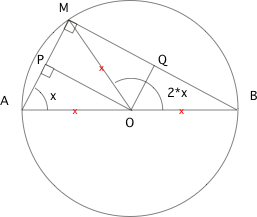 E-Bahut Barbidoux Posté(e) le 21 décembre 2013 E-Bahut Signaler Posté(e) le 21 décembre 2013 1a--------------- OP est la hauteur du triangle OAM issue de O OQ est la hauteur du triangle MOB issue de O Le triangle AMB est rectangle en M (triangle inscrit dans un cercle ayant un côté comme diamètre) La quadrilatère POQM est un rectangle. Dans ce rectangle aire MOP=aire MOQ or comme 2*aire MOP=aire MOA et 2*aire MOQ=Aire MOB ==> les triangles OAM et OBM ont même aire 1b--------------- OAM=OMA=x AOM=π-2*x ==> BOM=2*x 2--------------- Aire AOM=AM*PO/2 Dans le triangle APO sin(x)=PO/AO=PO cos(x)=AP/PO=AP d'où AOM=AM*PO/2=2*sin(x)*cos(x)/2=sin(2*x)/2 3--------------- Le secteur circulaire OMB a pour surface x*OA^2=x où x est exprimé en radian, et donc l'aire sous la corde MB a pour surface g(x)=x-sin(2*x)/2 4a--------------- h(x)=f(x)-g(x)=sin(2*x)-x h'(x)=2*cos(2*x)-1 4b/c--------------- ……..0……………….π/6………………….π/2 h'(x)…1……(+)..……..0……..(-)……………-3 h(x)….0…crois…….Max…..décrois……….. 4d--------------- Max=h(π/6}=0.342 h[π/2]=-1.570 La fonction h(x) étant décroissante sur [π/6, π/2] on en déduit que son graphe coupe l'axe des abscisses en un point unique dont l'abscisse est solution de h(x)=0. Sa valeurs a déterminée par dichotomie ==> 0.947<a<0.948 radian 5--------------- La différence entre l'aire f(x) du triangle OAM et l'aire g(x) sous la corde MB est maximale lorsque x≈ 0.9475*180/π=54.29°