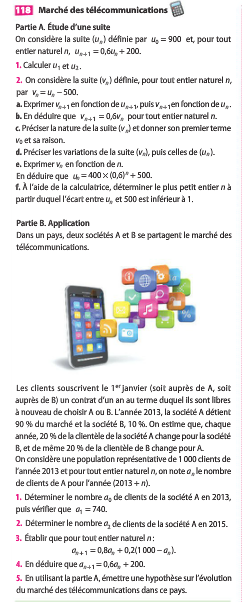 Guillaume74 Posté(e) le 5 janvier 2014 Auteur Signaler Posté(e) le 5 janvier 2014 1----------------- u0=900 un+1=0.6*un+200 --------- u1=540+200=740 u2=0.6*740+200=644 2----------------- vn=un-500 vn+1=un+1-500=0.6*un+200-500=0.6*un-300=0.6*(un-500)=0.6*vn --------- vn est une suite géométrique de raison 0.6 de premier terme v0=400 et de terme général vn=400*0.6^n -------- vn+1-vn= 0.6*Vn-vn=-0.4*vn vn étant une suite >0 on en déduit qu'elle est décroissante un=vn+500 l'est aussi ---------- un=vn+500=400*0.6*^n+500