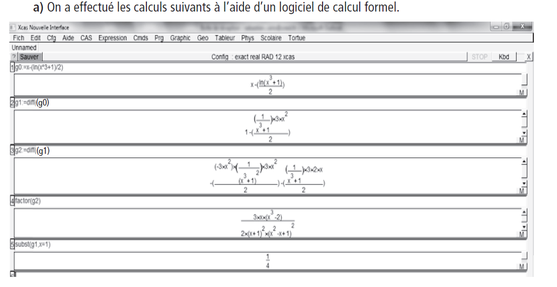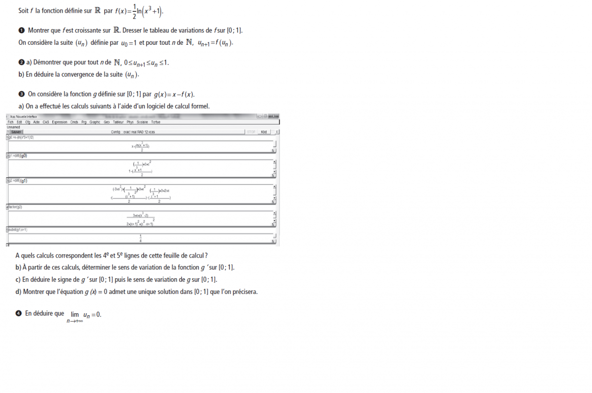 E-Bahut Barbidoux Posté(e) le 6 janvier 2014 E-Bahut Signaler Posté(e) le 6 janvier 2014 1------------- f(x)=ln(x^3+1)/2 f'(x)=3*x^2/(2*(x^3+1)) > sur [0,1] donc fonction croissante sur cet intervalle x………0………………….1 f(x)……0……..crois………ln(2) 2a------------- u0=1≥0 u1=0.347 ≥0 u2=0.0204 ≥0 …….. on suppose un≥0 un+1=ln(un^3+1)/2 comme un>0 ==>un^3+1==> ln(un^3+1)/2 >0 la proposition étant héréditaire est vérifiée pour toute valeur de n ---------------- u0=1 u1=0.347 ≤u0 u2=0.0204 ≤u1 …….. on suppose un≤un-1 un+1=ln(un^3+1)/2 un+1-un=ln(un^3+1)/2-ln(un-1^3+1)/2=ln((un^3+1)/un-1^3+1)) comme 0≤un≤un-1 ==> 0≤un^3≤un-1^3 ==> 0≤un^3+1≤un-1^3+1 ==> (un^3+1)/un-1^3+1)≤1 ==> ln((un^3+1)/un-1^3+1))≤0 ==> un+1-un≤0 n la proposition étant héréditaire est vérifiée pour toute valeur de n et la suite un est décroissante ---------------- 2b------------- La suite un étant bornée et décroissante est convergente et tend vers sa borne inférieure et lorsque n -> ∞ alors un ->0. 3a------------- g(x)=x-f(x) -------- La quatrième ligne de la feuille calcul correspond au calcul formel de la dérivée seconde g''(x) de la fonction g(x)=x-ln(x^3+1)/2. La cinquième ligne de la feuille calcul correspond au calcul de la valeur du nombre dérivé g'(1). 3b------------- g''(x)=3*(x^3-2)/(2*(x^3+1)^2) sur l'intervalle [0,1 ] g''(x)<0 ce qui signifie que g'(x) est décroissante sur cet intervalle g'(x)=1-3*x^2/(2*(x^3+1)) g'(0)=1 et g'(1)=1/4 et g'(x)<0 font que g'(x) est >0 sur l'intervalle [0,1] et donc g(x) est croissante sur cet intervalle. -------- g(0)=0 et g(1)= 1-ln(2)/2>0 Le graphe de g(x) coupe donc l'axes des x qu'en une valeur unique dont l'abscisse est égale à 0 et qui est solution de g(x)=0 sur l'intervalle [0,1] ------- Lorsque n-> ∞ alors f(un) -> un+1 ==> lim un+1=lim un=lim f(un) et comme lim g(un)=lim (un-f(un)) ->0 on en déduit que > un->0 lorsque n->∞