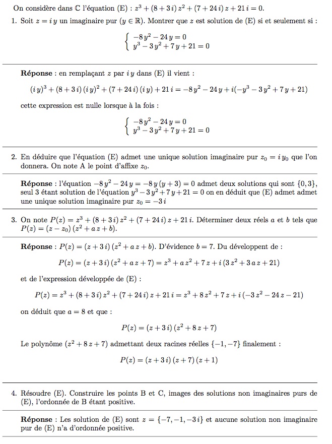 flavien23 Posté(e) le 8 février 2014 Signaler Posté(e) le 8 février 2014 Bonjours voici l’exercice qui me pose problème: On considère dans , l’équation (E) : z 3 +(8+3 i)z 2 +(7+24 i)z +21i= 0. 1) Soit z =i y un imaginaire pur ( y ∈R ). Montrer que z est solution de (E) si et seulement si : -8y² -24y=0 -y3-3y² +7y + 21=0 2) En déduire que l’équation (E) admet une unique solution imaginaire pur z 0 =i y 0 que l’on donnera. On note A le point d’affixe z 0. 3) On note P (z )=z 3 +(8+3 i)z 2 +(7+24 i)z +21i .Déterminer deux réels a et b tels que P (z )=(z −z 0 )(z² +az +b ). 4) Résoudre (E). Construire les points B et C, images des solutions non imaginaires purs de (E), l’ordonnée de B étant positive. je pense avoir réussi les deux première question, mais je n'arrive pas a faire les question 3) et 4). pourriez vous m'aider. merci