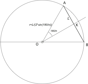 E-Bahut Barbidoux Posté(e) le 9 mars 2014 E-Bahut Signaler Posté(e) le 9 mars 2014 Dans un polygone régulier à n côté l'angle au centre correspondant à un côté vaut 360/n. Dans le triangle AKO rectangle en K construit à partir de la médiatrice d'un côté du polygone l'angle AOK vaut 180/n par définition dans un triangle rectangle le sinus d'un angle aigu est égal à la longueur du côté opposé sur celle de l'hypoténuse donc sin(AOK)=AK/r et comme AOK=180/n==> sin(180/n)=L/(2*r) ==> r=L/(2*sin(180/n)).Par exemple le rayon du cercle circonscrit à un hexagone dont le côrté vaut 5 cm vaut r=5/(2*sin(180/6))=5/(2*sin(30°)à=5