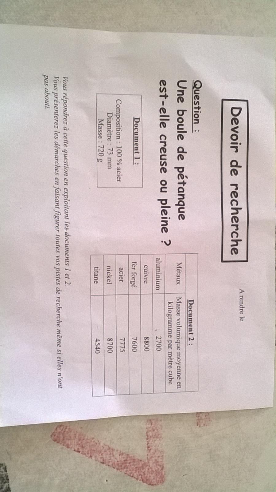aigues-30 Posté(e) le 11 mars 2014 Signaler Posté(e) le 11 mars 2014 bonjour pouver vous m'aider pour ce dm de math. question: une boule de pétanque est-elle creuse ou pleine? document1: composition: 100% acier diametre: 73mm masse: 720g document2: masse volumique moyenne en kg par metre cube aluminium 2700 cuivre 8800 fer forgé 7600 acier 7775 nickel 8700 titane 4540 merci d'avance pour votre aide