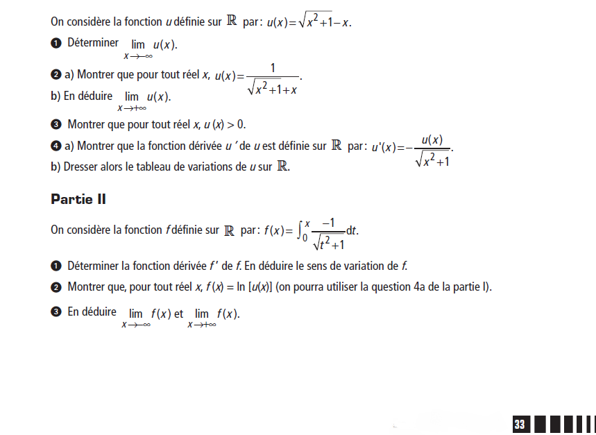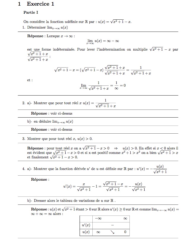 emilie4 Posté(e) le 12 mars 2014 Signaler Posté(e) le 12 mars 2014 Bonjour , je bloque sur l'exercice ci-dessous , et je sollicite votre aide s'il vous plait. On considère la fonction u définie sur R par : u(x)=racine carrée x^2+1-x 1.Déterminer lim u(x) x -> - infini 2.a) Montrer que pour tout réel x , u(x)=1/racine carrée x^2+1+x b) En déduire lim u(x) x -> + infini 3.Montrer que pour tout réel x , u(x)>0. 4.a)Montrer que la fonction dérivée u' de u est définie sur R par : u'(x)= - u(x)/racine carrée x^2+1. b)Dresser alors le tableau de variations de u sur R. Je précise que c'est exactement l'énoncé (au cas où il manquerait des parenthèses). Merci a tous ceux qui m'aideront.