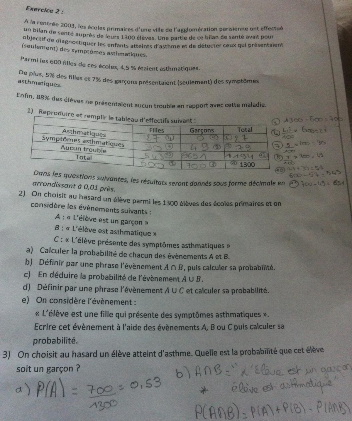 E-Bahut Papy BERNIE Posté(e) le 4 avril 2014 E-Bahut Signaler Posté(e) le 4 avril 2014 d) A U C est l'événement :l'élève choisit est un garçon ou il présente des symptômes asthmatiques. Tu ajoutes le nb de garçons(=700) et le nb des élèves qui présentent des symptômes asthmatiques(=79) puis tu enlèves le nb de garçons qui présentent des symptômes asthmatiques (=30) sinon ces derniers seront comptés 2 fois !! Et tu mets sur 1300 comme dénominateur. On a donc : 700+79-30=749 sur 1300 qui sont garçons qui présente des symptômes asthmatiques. P(A U C)=749/1300 ~0.58 e) C'est l'événement : L'élève est une fille et elle présente des symptômes asthmatiques. Il y a 600 filles dont 30 présentent des symptômes asthmatiques. P (A barre inter C)=30/600=0.05 3) Encore un arrondi faux : 50/77 ~0.649.. Donc la proba est ~ 0.65. OK ? Bonne soirée à toi.