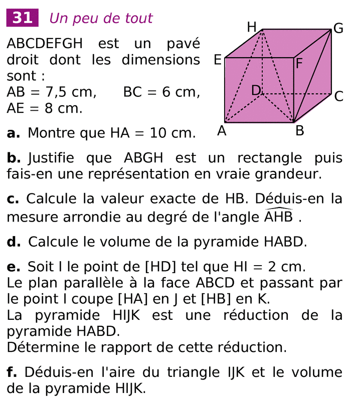 E-Bahut Papy BERNIE Posté(e) le 11 avril 2014 E-Bahut Signaler Posté(e) le 11 avril 2014 d) V pyramide=(1/3)*aire base * hauteur. La hauteur de la pyramide HABD est HD=8 cm. La base est le triangle DAB qui est rectangle en A. Tu peux dessiner sur ton brouillon la carré ABCD avec AB=7.5 cm et BC=6 cm pour bien voir , si nécessaire le triangle DAB, rectangle en A.. Aire du triangle DAB=(AD*AB)/2=(6*7.5)/2=22.5 cm² V pyramide HABD=(1/3)*8*22.5=.....cm3