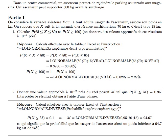 JeSuisCHARLIE Posté(e) le 22 avril 2014 Signaler Posté(e) le 22 avril 2014 Bonjour tout le monde, Avant de commencer, je vous souhaite une bonne fête de pâques et que j'espère que vous avez profité pour se reposer ! j'ai ici 2 exercices de probabilités que je n'arrive pas à faire. EXERCICE 1: Une entreprise fabrique un jouet qui projette vers le haut une <<puce>> que les enfants doivent essayer d'attraper. la hauteur maximale X atteinte par la puce suit la loi normale de moyenne micro et d'écart type sigma. La machine est conçue pour que dans 75% des cas, la puce atteigne une hauteur comprise entre 10 et 15 cm. Cependant, dans 7% des cas, la puce dépasse les 15 cm. 1) Montrer que: P(X>10)=0,82 et P(X<15)=0,93. 2) En déduire des valeurs rapprochées à 10^-2 près de (10-micro/sigma) et (15-micro/sigma). 3) A partir des valeurs précédentes, déterminer des valeurs approchées de micro et sigma. 4) A partir des précédents résultats, déterminer la probabilité que la puce atteigne une hauteur maximale comprise entre 8 et 12cm. EXERCICE 2: Dans un centre commerciale, un ascenseur permet de rejoindre le parking souterrain aux magasins. Ct ascenseur peut supporter 500kg avant la surcharge. PARTIE 1 On considère la variable aléatoire X qui, à toute adulte usager de l'ascenseur, associe son poids en kg. On suppose que X suit la loi normale d'espérance mathématique 70kg et d'écart type 15kg. 1) Calculer P(65<X<80) et P(X>100) (on donnera des valeurs approchés de ces résultats à 10^-2). 2) Donner une valeur approchée à 10^-2 près du réel positif M tel que P(X<M)=0,95. Interpréter le résultat obtenu à l'aide d'une phrase. PARTIE 2 On admet que le poids total de n adultes usagers de l'ascenseur, dont les poids sont indépendants, est une variable aléatoire Yn qui suit la loi normale d'espérance mathématique 70nkg et d'écart type 15racine carrée de n kg. On note pn la probabilité de surcharge quand il y a n adultes dans l'ascenseur: pn=P(Yn>500). 1) Calculer p5, p6, p7, p8 et p9 (on donnera des valeurs approchés de ces résultats à 10^-2). 2) Le nombre maximum n de personnes autorisés dans l'ascenseur est calculé de telle sorte que la probabilité que l'ascenseur soit en surcharge avec n adultes est inférieur ou égale à 0,1. Déterminer le nombre maximum de personnes pouvant entrer dans cet ascenseur. Merci beaucoup de votre attention.