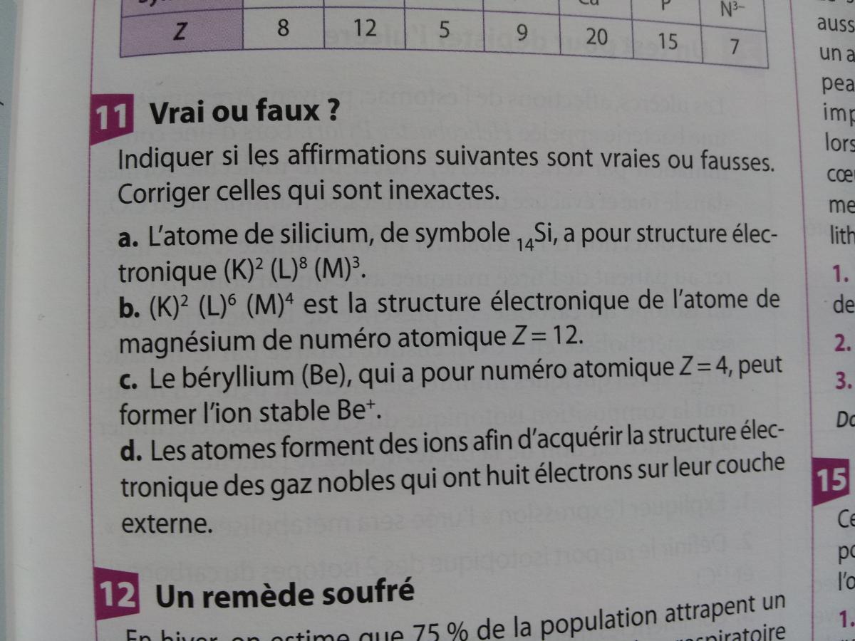 E-Bahut Barbidoux Posté(e) le 5 mai 2014 E-Bahut Signaler Posté(e) le 5 mai 2014 11a——————— Faux 14Si=(K)^2(L)^8(M)^4 11b——————— Faux 12Mg=(K)^2(L)^8(M)^2 11c——————— Faux il forme Be^(2+) qui a la structure électronique de He 11d——————— Vrai 18——————— Kalurie recherche de l’ion potassium K^(+) Calcurie recherche de l’ion calcium Ca^(2+) hyperkalurie (excès de potassium 5.5 g/L > à 4 g/l (valeur normale) hypo calciurie défaut de calcium 100 mg /L < à 120 mg/L