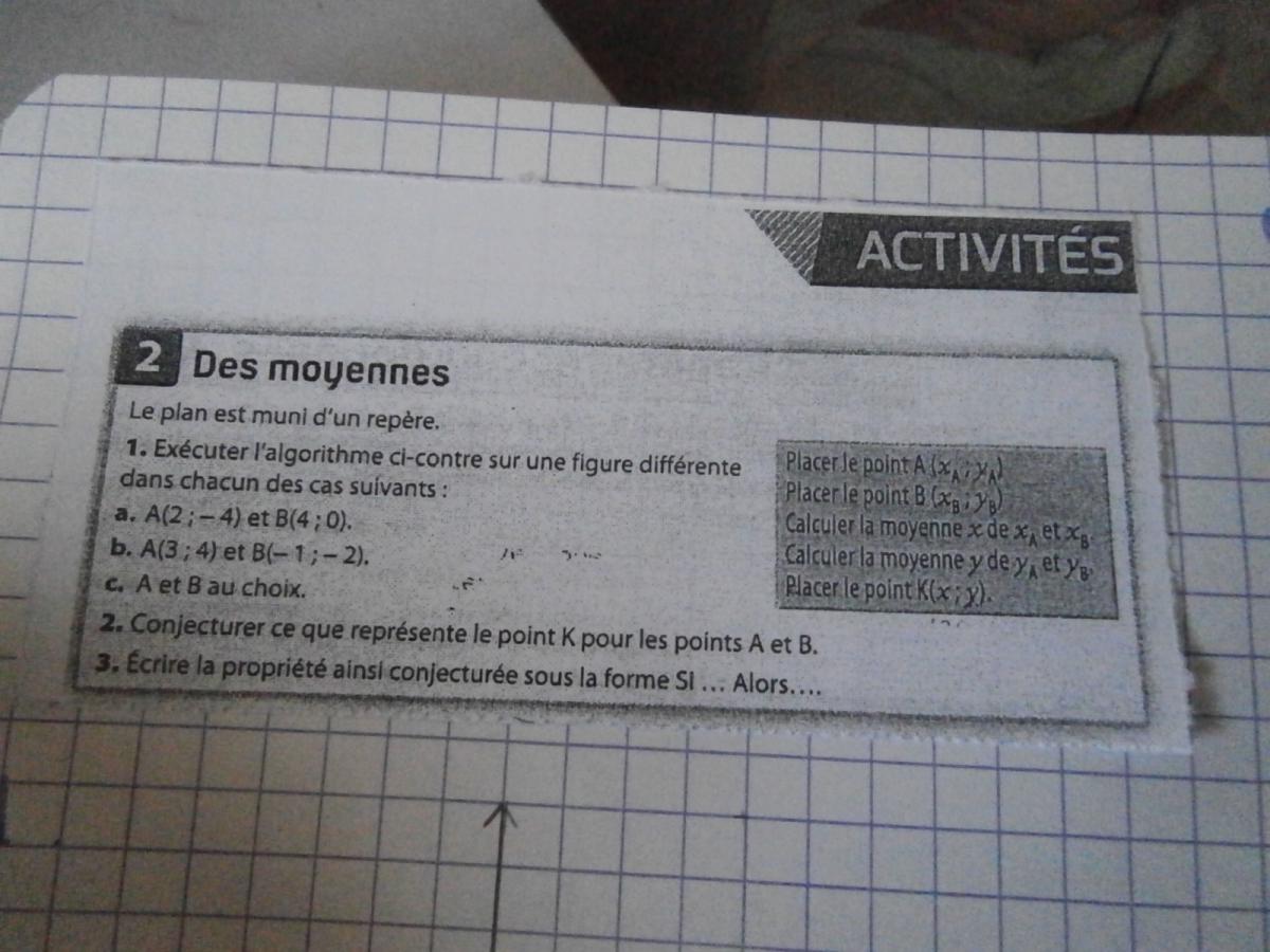 E-Bahut Papy BERNIE Posté(e) le 6 septembre 2014 E-Bahut Signaler Posté(e) le 6 septembre 2014 Bonjour, comme Denis ne semble pas connecté , je te réponds : a) moyenne "x" de xA et xB : x=(2+4)/2=3 moyenne "y" de yA et yB : y=(-4+0)/2=-2 Donc tu places K(3;-2) Et tu vas conjecturer que le point K est le milieu du segment [AB]. b) c) Tu fais seule. 2) Tu envoies ta réponse ?
