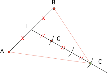 E-Bahut Barbidoux Posté(e) le 4 octobre 2014 E-Bahut Signaler Posté(e) le 4 octobre 2014 Définition du centre de gravité : point de concours des médianes située au 2/3 de la longueur de chaque médiane à partir des sommets. Prendre la droite qui passe par le centre I de AB et G et reporter GB=2*IG.