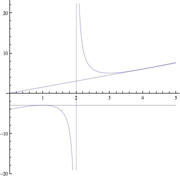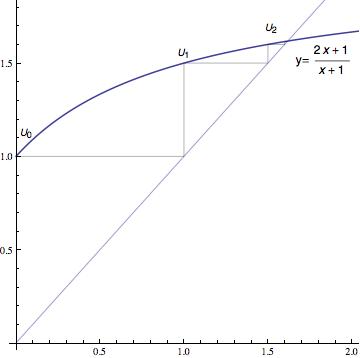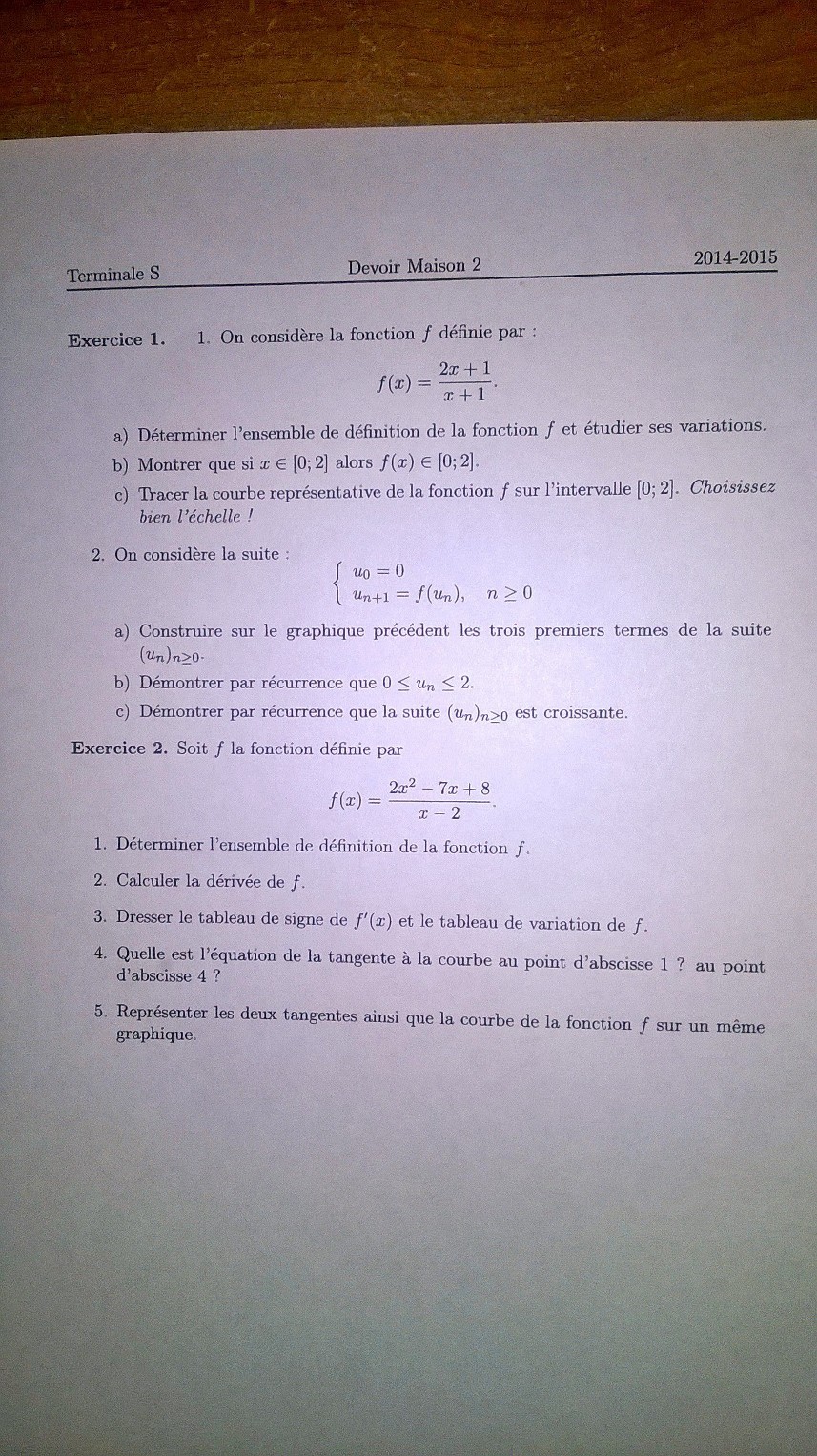 E-Bahut Barbidoux Posté(e) le 5 octobre 2014 E-Bahut Signaler Posté(e) le 5 octobre 2014 1.1a———————— f(x)=(2*x+1)/(x+1) Ensemble de définition R-{-1} 1.1b———————— f’(x)=2/(1+x)-(1+2*x)/(1+x)^2=1/(1+x)^2>0 donc fonction croissante f(0)=1 et f(2)= 5/3 ==> f(x)appartient à [1,5/3] donc à [0,2] 1.1c———————— 1.2a———————— 1.2b———————— initialisation 0≤u1=1≤2 vrai à l’ordre 1 0≤u2=3/2≤2 vrai à l’ordre 2 0≤u3=8/5 ≤2 vrai à l’ordre 3 on suppose 0≤un≤2 ———— un+1=(2*un+1)/(un+1)=(2*(un+1)-1)/(un+1)=2-1/(un+1) comme u0<un<2 ==> 0≤un+1≤2 La relation étant héréditaire est vérifiée pour toute valeur de n 1.2c———————— u1-u2<0 u2-u3<0 on suppose un-un-1<0 —————— un+1=2-1/(un+1) un=2-1/(un-1+1) un+1-un=1/(un-1+1)-1/(un+1)=(un-un-1)/((un-1+1)*(un+1)) les termes de la suite un étant >0 un+1-un=(un-un-1)/((un-1+1)*(un+1))<0 La relation étant héréditaire est vérifiée pour toute valeur de n —————————————————————————— 2.1———————— f(x)=(2*x^2-7*x+8)/(x-2) définie sur R-{2} 2.2———————— f’(x)=4*x-7/(x-2)-(2*x^2-7*x+8)/(x-2)^2=2*(x^2-4*x+3)/(x-2)^2 d’évidence le trinôme x^2-4*x+3 admet deux racines x=1 et x=3 et est du signe du coefficient de x^2 l’extérieur d ses racines x……………………1…………………..2…………………….3……………… f’(x)……….(+)……(0)……..(-)…………………(-)…………(0)…….(+)…… f(x)…….crois…….Max……decrois…||…..décrois……….Min….crois…, 2.3———————— équation des tangentes pour x=3 minimum et f’(x)=0 y=f(1)=-3 ————— pour x=4 y=f’(4)*(x-4)+f(4)=3*x/2 2.4————————