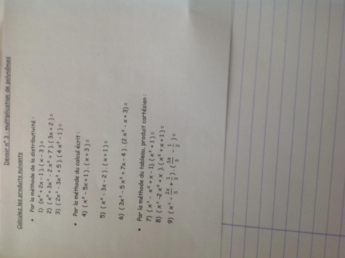 Libllule Posté(e) le 15 octobre 2014 Signaler Posté(e) le 15 octobre 2014 Bonjour, qu'est ce que ta prof appelle méthode du calcul écrit et méthode du tableau, produit cartésien ? Voici les résultats pour la distributivité : 1) x^3 - x² - 7x +3 2 ) 3x^5 + 11x^4 - 4x² +21x +14 3) 8x^5 - 12x^4 + 2x^3 + 23x² - 5