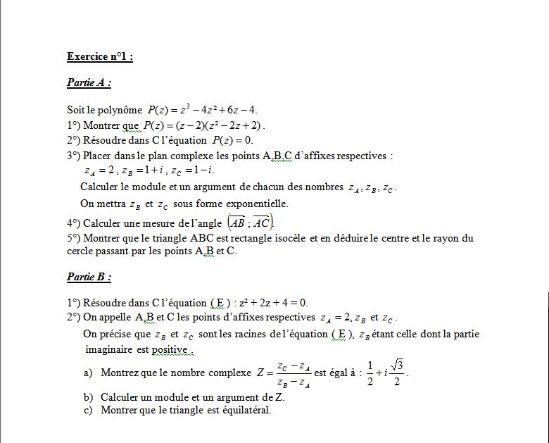 E-Bahut Barbidoux Posté(e) le 12 octobre 2014 E-Bahut Signaler Posté(e) le 12 octobre 2014 Exercice 1 partie A 5--------- (AB,AC)= arg(zAB)-Arg(zAC)=π/2 comme |AB|=|zAB|=|AC|=|zAC| tu en déduis que le triangle ABC est rectangle en A qu'il est inscrit dans un cerce de centre {1,0} (milieu de BC) et de rayon 1 Partie B calculer (AC,AB)= arg(zAC)-Arg(zAB)=π/3 comme |AB|=|zAB|=|AC|=|zAC| on en déduit que le triangle ABC est équilatéral