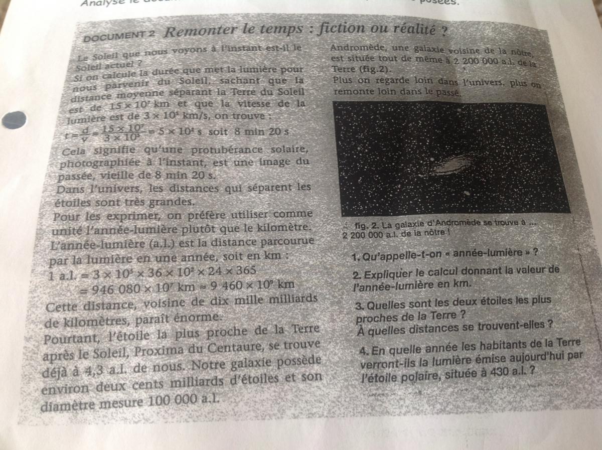 E-Bahut Denis CAMUS Posté(e) le 18 octobre 2014 E-Bahut Signaler Posté(e) le 18 octobre 2014 Question 1 : voir ligne 16 Question 2 : Dans l'ordre : vitesse X nb de secondes dans une heure X nb d'h dans une journée X nb de jours dans un an. Rien de compliqué. Question 3 : ligne 23 et la deuxième étoile est peut-être dans la partie coupée du texte. En tout cas elle et sur le Net. Question 4 : Dans 430 ans Ps : Ta classe de 5è en Belgique correspond-elle à la classe de 1ère en France, c'est à dire vers 16 17 ans ?