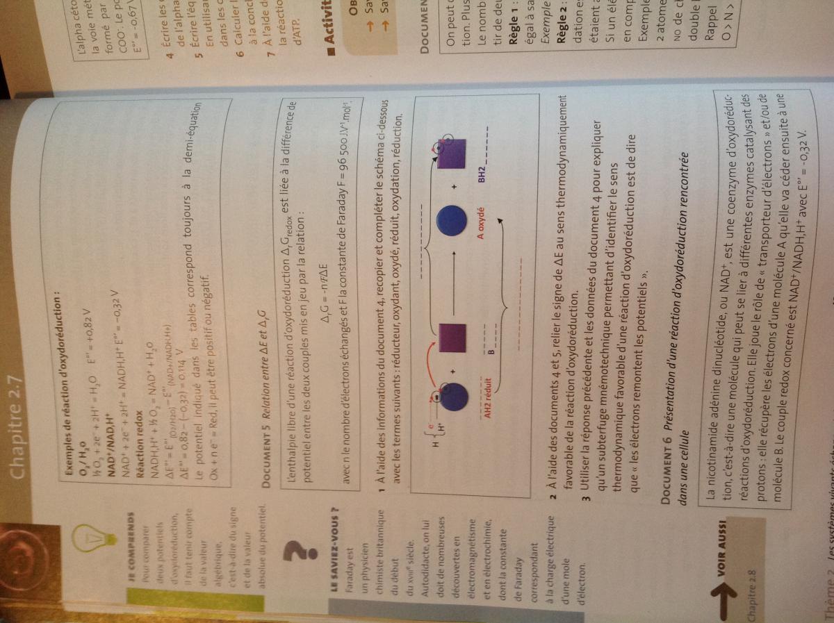 E-Bahut Barbidoux Posté(e) le 23 octobre 2014 E-Bahut Signaler Posté(e) le 23 octobre 2014 relis ce que j'ai écrit : Réaction d’oxydo-réduction AH2 + B —> A+ BH2 si la réaction est thermodynamiquement favorable (et on peut légitimement le penser puisque elle est supposée se dérouler dans le sens où elle est écrite ) alors par convention ∆rG<0 et comme ∆rG=-n*F*∆E=-n*F*(E(B/BH2)- E(A/ABH2)) on en déduit que E(B/BH2)< E(A/AH2). Pour en être certain il faudrait connaître les potentiels thermodynamiques E(B/BH2)et E(A/ABH2). des deux couples B/BH2 et A/AH2).