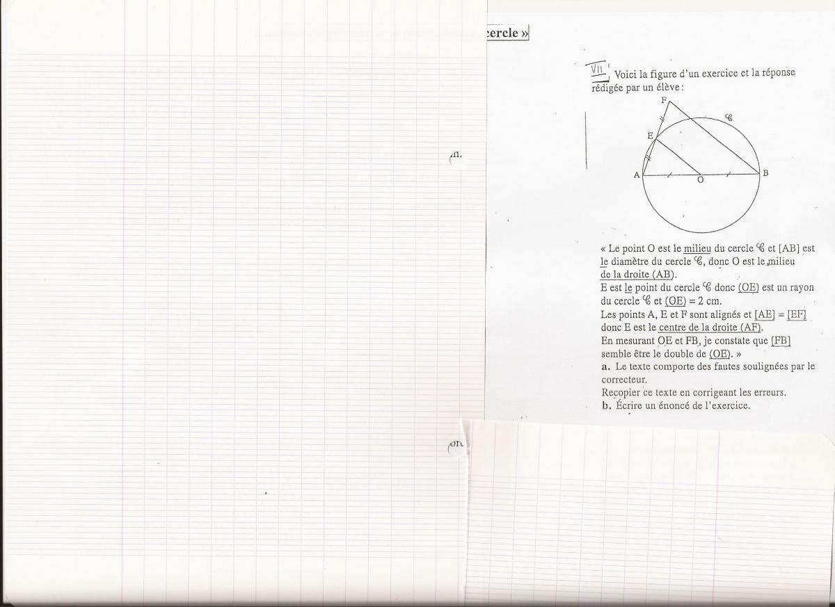 Elfy54000 Posté(e) le 27 octobre 2014 Auteur Signaler Posté(e) le 27 octobre 2014 Désolé j'ai eu un petit problème je recommence : Bonjour, je n'arrive pas à faire le "b" de l'exercice ci-dessous c'est surtout le mot "Énoncé" qui me gêne merci d'avance . Voici l'exercice "b" ci-dessous. < Le point O est le centre du C et [AB] est un diamètre du cercle C donc O est le milieu du segment [AB] . E est un point du cercle C donc [OE] est un rayon du cercle C et OE = 2cm . Les points A , E et F sont alignés et AE =EF donc E est le milieu de la droite (AF). En mesurant OE et FB je constate que FB semble être le double de OE.> b. Écrire un énoncé de l'exercice.