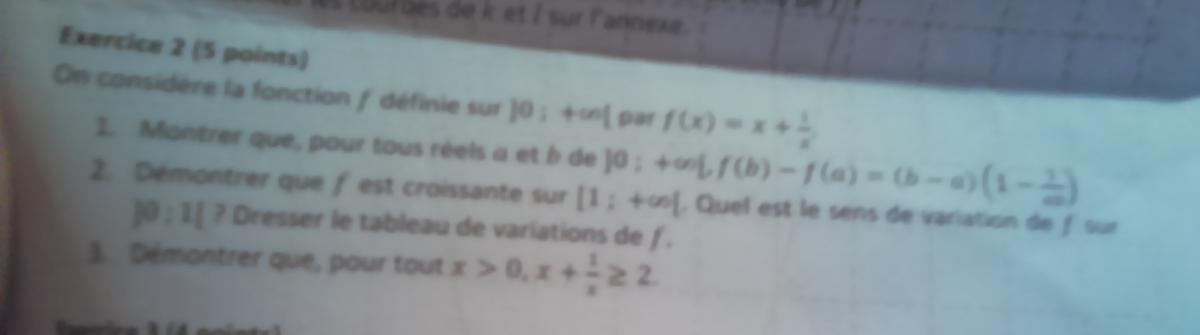 E-Bahut Barbidoux Posté(e) le 1 novembre 2014 E-Bahut Signaler Posté(e) le 1 novembre 2014 1———————— f(x)=x+1/x f(b)-f(a)=b+1/b-a-1/a=b-a+1/b-1/a=b-a+(a-b)/(a*b)=(b-a)*(1-1/(ab)) 2———————— si a et b appartiennent à [1,∞[ et tesl que b>a alors (b-a)>0 et 1/(a*b)<1 ==> f(b)-f(a)>0 et la fonction f(x) est croissante sur ce intervalle 3———————— f’(x)=1-1/x^2=(x^2-1)/x^2=(x-1)*(x+1)/x^2 s’annule pour x=-1 et x=1 et est du signe du coefficient de x^2 à l’exterieur de ses racines x…………….(-1)……………….(0)………………(1)………………. f’(x)…..(+)……(0)…..(-)…………………(-)………(0)…….(+)……. f(x)…..crois…Max….decrois….||…….decrois…..Min……crois…… sur [0, ∞[ la fonction qui est décroisante puis croissante, passe par un minimum pour x=1 qui vaut f(1)=2 on peut donc en déduire que f(x)≥ f(1)=2