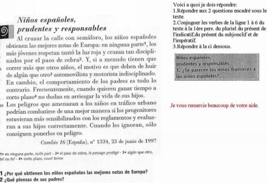 DIKTP9 Posté(e) le 28 janvier 2004 Signaler Posté(e) le 28 janvier 2004 question 2: "Los padres son el contrario de sus niños porque, para ganar tiempo cruzan de cualquier manera la calle. Ese padres no puedan aprender correctamente a evitar los peligros a sus niños" je suis pas sur que je vais faire la conjugaison