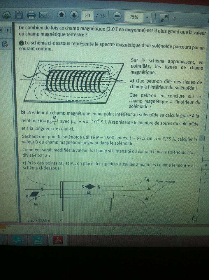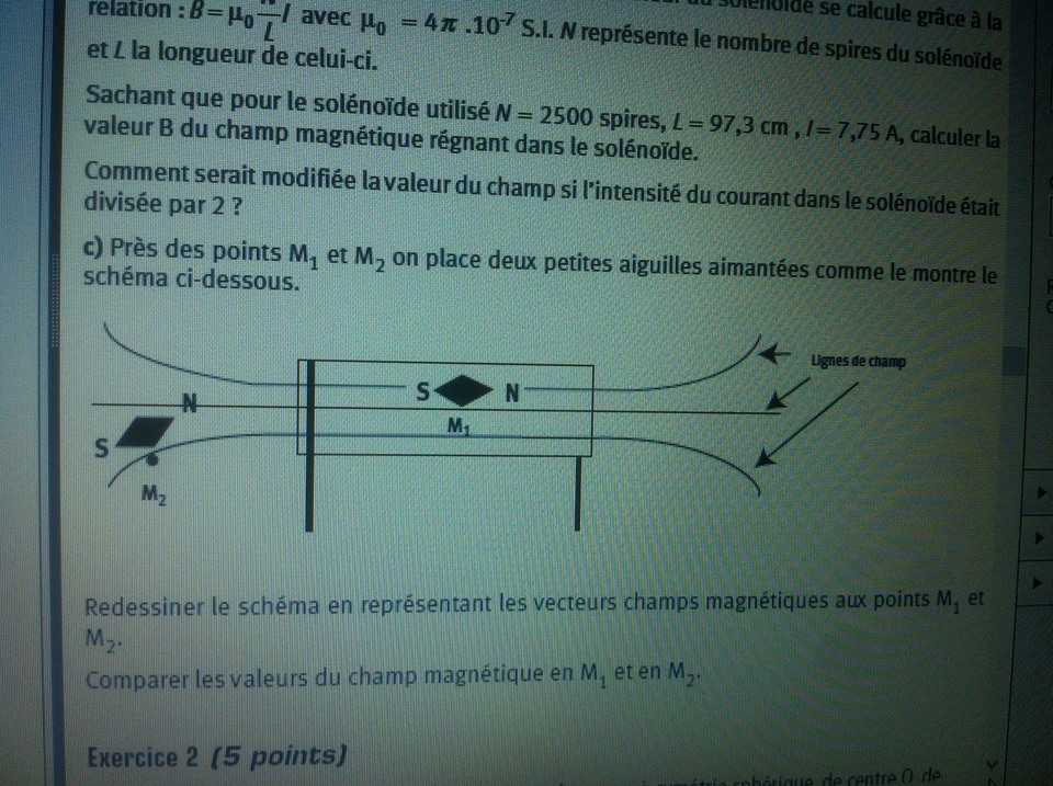 E-Bahut Barbidoux Posté(e) le 10 novembre 2014 E-Bahut Signaler Posté(e) le 10 novembre 2014 1—————— lignes de champ //= à l’intérieur du solénoïde, le champ y est constant B=4.*10^(-7)*2500*7.75/0.973= 7.97*10^(-3) T B proportionnel à I donc si I divisé par 2 B est divisé par 2 ----------------