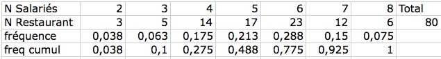 E-Bahut Barbidoux Posté(e) le 16 novembre 2014 E-Bahut Signaler Posté(e) le 16 novembre 2014 une enquête a été réalisée dans des restaurants de Nîmes pour connaitre le nombre de leurs salariés. Le résultat de cette enquête est répertorié dans un tableur : 1)quelle formule a-t-on saisi dans la cellule i12 pour obtenir le nombre total de restaurants? ————————— =somme(B2;H6) ————————— 2)on souhaite calculer les frequences de chaque valeur. Pour cela que doit on saisir dans la cellule B3 afin de la recopier jusqu'en H3? ————————— =B2/80 ————————— 3)calculer la fréquence de la valeur "4" salariés.donne le résultat sous forme décimale et en pourcentage. ————————— 14/80=0,175=17.5% ————————— 4)calcule le nombre moyen d'employés dans ces restaurants. ————————— (3*2+5*3+14*4+17*5+23*6+12*7+6*8)/80=5.4 ————————— 5)calcule le nombre médian de salariés. que cela signifie t-il? ————————— 5 salariés (50% des restaurant ont 5 ou moins de 5 salariés) ————————— 6)determine les premiers et troisieme quartiles. ————————— premier quartile compris entre 3 et 4 (25% de l’effectif) Troisième quartile compris entre 5 et 6 (75% de l’effectif) ————————— 7)peut on dire qu'au moins 25 pour cent des restaurants on moins de 4 employés? ————————— non car la fréquence cumulée des restaurant ayant moins de 4 employés vaut 0.1 ————————— 8)calcule le pourcentage de restaurant ayant au moins 4 employés. ————————— 1-0.1=0,9=90% —————————